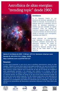 En esta charla presentaré un poco de lo que en astrofísica denominamos ciencia de altas energías. Hablaré de manera breve sobre los principales problemas a los que nos enfrentamos los astrónomos cuando queremos detectar fotones, o luz, tan energética como los Rayos X y Rayos Gamma. Aunque sabemos que la producción de este tipo de fotones tan energéticos están generalmente asociados a los procesos más violentos en el universo, como las supernovas, la fusión de agujeros negros o estrellas de neutrones, y la transferencia de masa en sistemas binarios, las escalas de tiempo en las que ocurren estos fenómenos pueden ser tan cortas como unos cuantos segundos. Por ello, siempre resulta todo un reto observarlos de manera óptima. En mi charla presentaré algunos casos científicos en los que actualmente trabajamos los investigadores del Instituto de Astronomía aquí en Ensenada, y cómo es que utilizamos los instrumentos del Observatorio Astronómico Nacional en San Pedro Mártir para este fin.