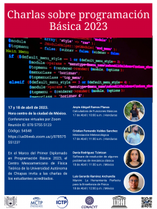 En el Marco del Primer Diplomado en Programación Básica 2023, el Centro Mesoamericano de Física Teórica de la Universidad Autónoma de Chiapas invita a las charlas de los estudiantes acreditados.