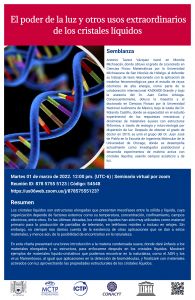 En esta charla presentaré una breve introducción a la materia condensada suave, donde daré énfasis a los materiales elongados y su estructura, para enfocarme después en los cristales líquidos. Mostraré ejemplos de materiales liquido-cristalinos que podemos encontrar en la naturaleza, como el ADN y los virus filamentosos, al igual que aplicaciones en la detección de biomoléculas, y finalizaré con materiales activados con luz aprovechando las propiedades estructurales de los cristales líquidos.