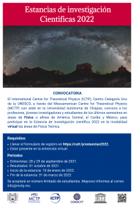 El International Centre for Theoretical Physics (ICTP), Centro Categoría Uno de la UNESCO, a través del Mesoamerican Centre for Theoretical Physics (MCTP) con sede en la Universidad Autónoma de Chiapas, convoca a los profesores,  jóvenes investigadores y estudiantes de los últimos semestres en áreas de Física o afines de América Central, el Caribe y México, para participar en la Estancia de investigación científica 2022 en la modalidad virtual en el área de Física Teórica