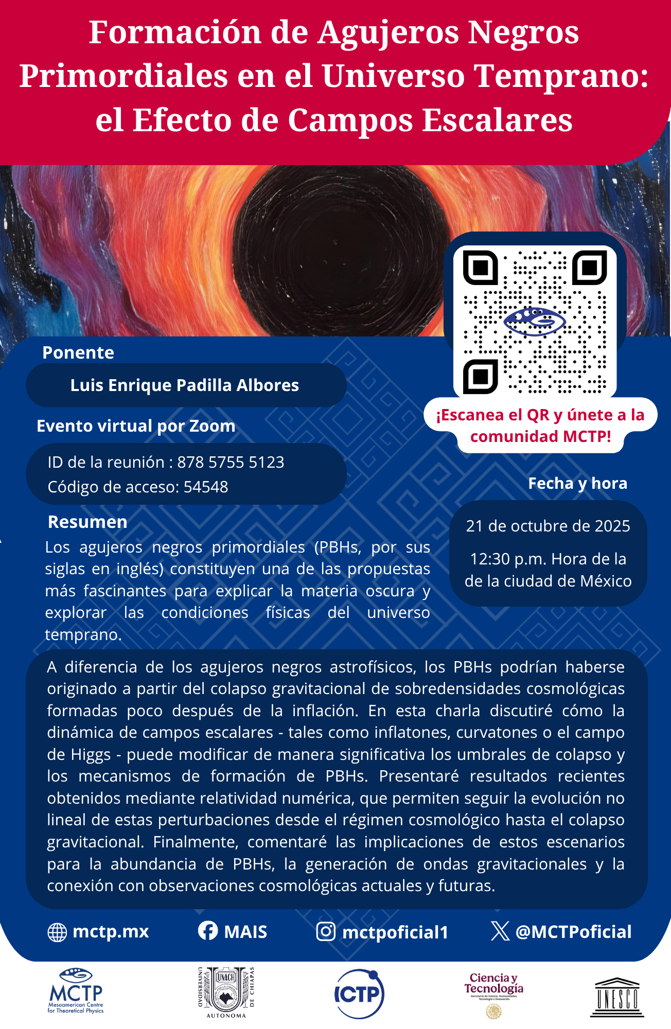A diferencia de los agujeros negros astrofísicos, los PBHs podrían haberse originado a partir del colapso gravitacional de sobredensidades cosmológicas formadas poco después de la inflación. En esta charla discutiré cómo la dinámica de campos escalares - tales como inflatones, curvatones o el campo de Higgs - puede modificar de manera significativa los umbrales de colapso y los mecanismos de formación de PBHs. Presentaré resultados recientes obtenidos mediante relatividad numérica, que permiten seguir la evolución no lineal de estas perturbaciones desde el régimen cosmológico hasta el colapso gravitacional. Finalmente, comentaré las implicaciones de estos escenarios para la abundancia de PBHs, la generación de ondas gravitacionales y la conexión con observaciones cosmológicas actuales y futuras.