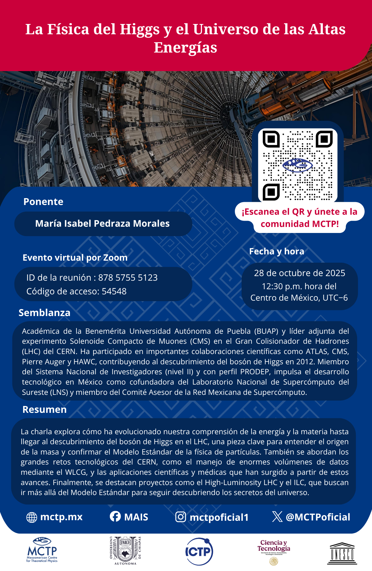 a charla aborda el concepto de energía y materia hasta el descubrimiento del bosón de Higgs en el LHC, clave para comprender el origen de la masa y confirmar el Modelo Estándar. Expone los retos tecnológicos del CERN, como el manejo de grandes volúmenes de datos mediante el WLCG, y las aplicaciones científicas y médicas derivadas. Finalmente, destaca que proyectos como el High-Luminosity LHC y el ILC impulsan la exploración de la física más allá del Modelo Estándar, en la búsqueda por entender el universo.