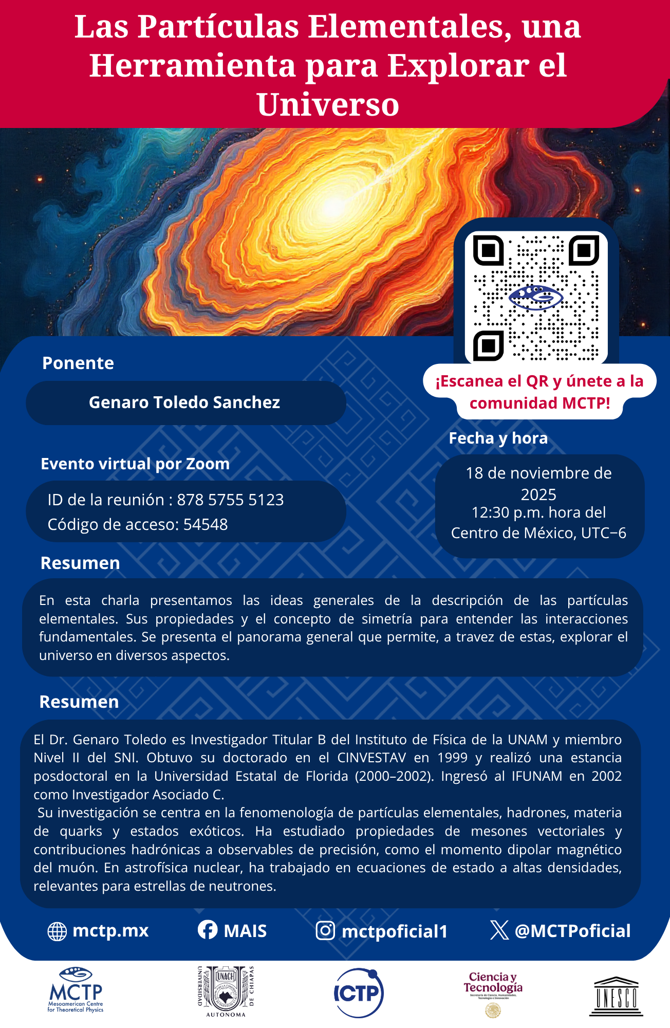 El Dr. Genaro Toledo es Investigador Titular B del Instituto de Física de la UNAM y miembro Nivel II del SNI. Obtuvo su doctorado en el CINVESTAV en 1999 y realizó una estancia posdoctoral en la Universidad Estatal de Florida (2000–2002). Ingresó al IFUNAM en 2002 como Investigador Asociado C.
