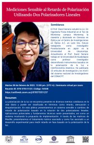 La polarización de la luz se encuentra presente en diversos eventos cotidianos en la vida diaria y puede ser clasificada en términos como retardo, atenuación o despolarización. En esta plática presentaremos un sistema sensible a cambios de retardo de polarización basado en la rotación de dos polarizadores lineales. Aplicaciones potenciales y fundamentos técnicos serán presentados, así como un sistema mostrando la propuesta de implementación. A través de las matrices de Mueller, presentaremos el tratamiento teórico asociado y como fue asociado a un desarrollo experimental para medir retardo en fase basado en la polarización de la luz.