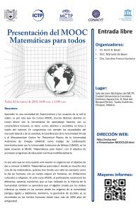 Aprender es una necesidad de Supervivencia y los usuarios de la red lo saben, es por esto que los Cursos MOOC, (Cursos Masivos abiertos en línea) ahora son la herramienta de aprendizaje favorita, por su característica inclusiva, es decir, cursos abiertos y accesibles en línea a través del internet. En congruencia con atender las necesidades del mercado laboral y de la sociedad, la Coordinación de la Universidad Virtual y el Mesoamerican Centre for Theoretical Physics de la Universidad Autónoma de Chiapas (UNACH) como trabajo de colaboración interinstitucional con la Universidad Autónoma de México (UNAM), se ha dado creación al MOOC Matemáticas para Todos, con el objetivo de promover programas de educación continua multidisciplinaria.