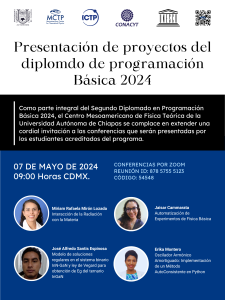 Como parte integral del Segundo Diplomado en Programación Básica 2024, el Centro Mesoamericano de Física Teórica de la Universidad Autónoma de Chiapas se complace en extender una cordial invitación a las conferencias que serán presentadas por los estudiantes acreditados del programa.
