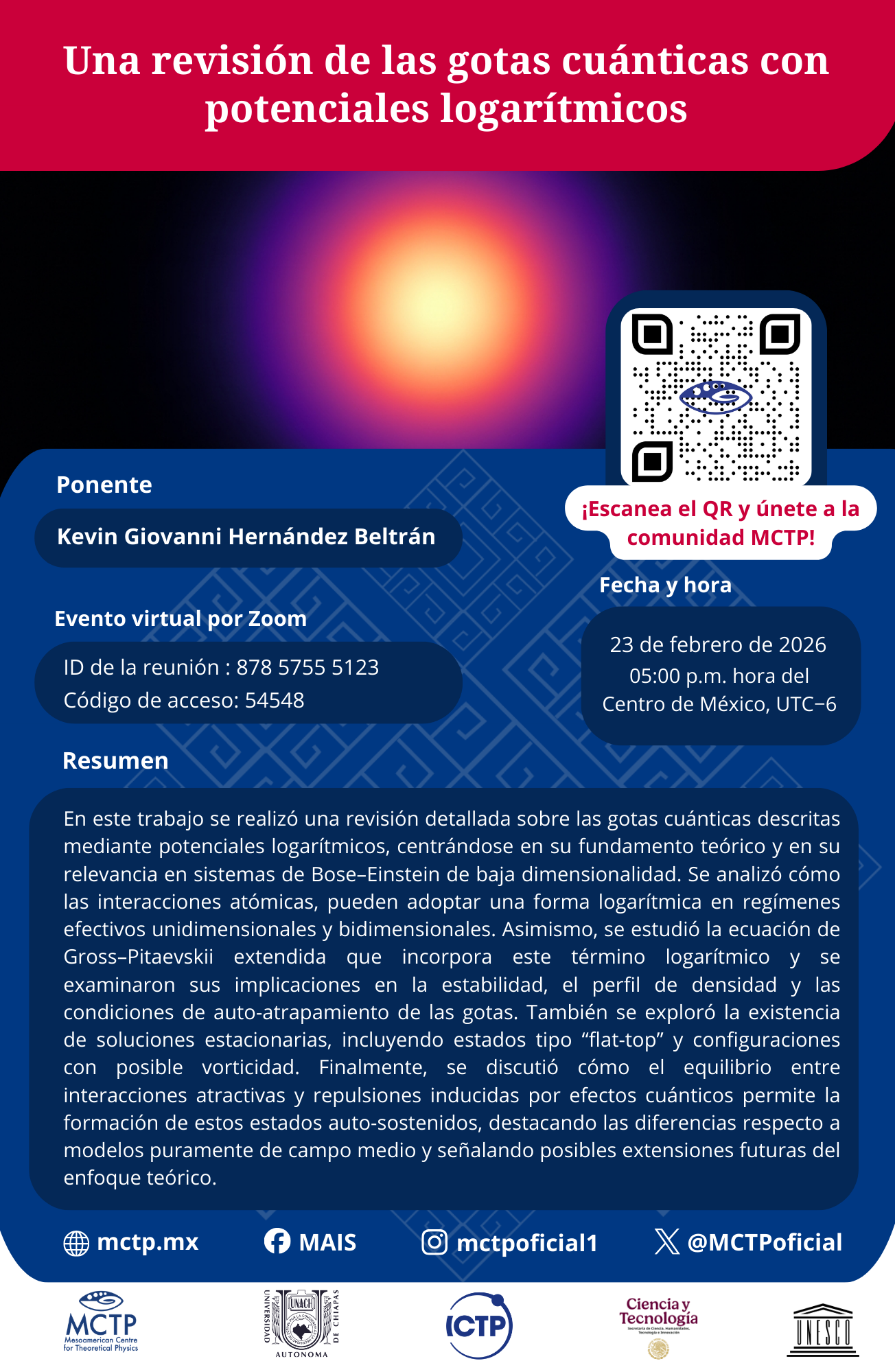 En este trabajo se realizó una revisión detallada sobre las gotas cuánticas descritas mediante potenciales logarítmicos, centrándose en su fundamento teórico y en su relevancia en sistemas de Bose–Einstein de baja dimensionalidad. Se analizó cómo las interacciones atómicas, pueden adoptar una forma logarítmica en regímenes efectivos unidimensionales y bidimensionales. Asimismo, se estudió la ecuación de Gross–Pitaevskii extendida que incorpora este término logarítmico y se examinaron sus implicaciones en la estabilidad, el perfil de densidad y las condiciones de auto-atrapamiento de las gotas. También se exploró la existencia de soluciones estacionarias, incluyendo estados tipo “flat-top” y configuraciones con posible vorticidad. Finalmente, se discutió cómo el equilibrio entre interacciones atractivas y repulsiones inducidas por efectos cuánticos permite la formación de estos estados auto-sostenidos, destacando las diferencias respecto a modelos puramente de campo medio y señalando posibles extensiones futuras del enfoque teórico.